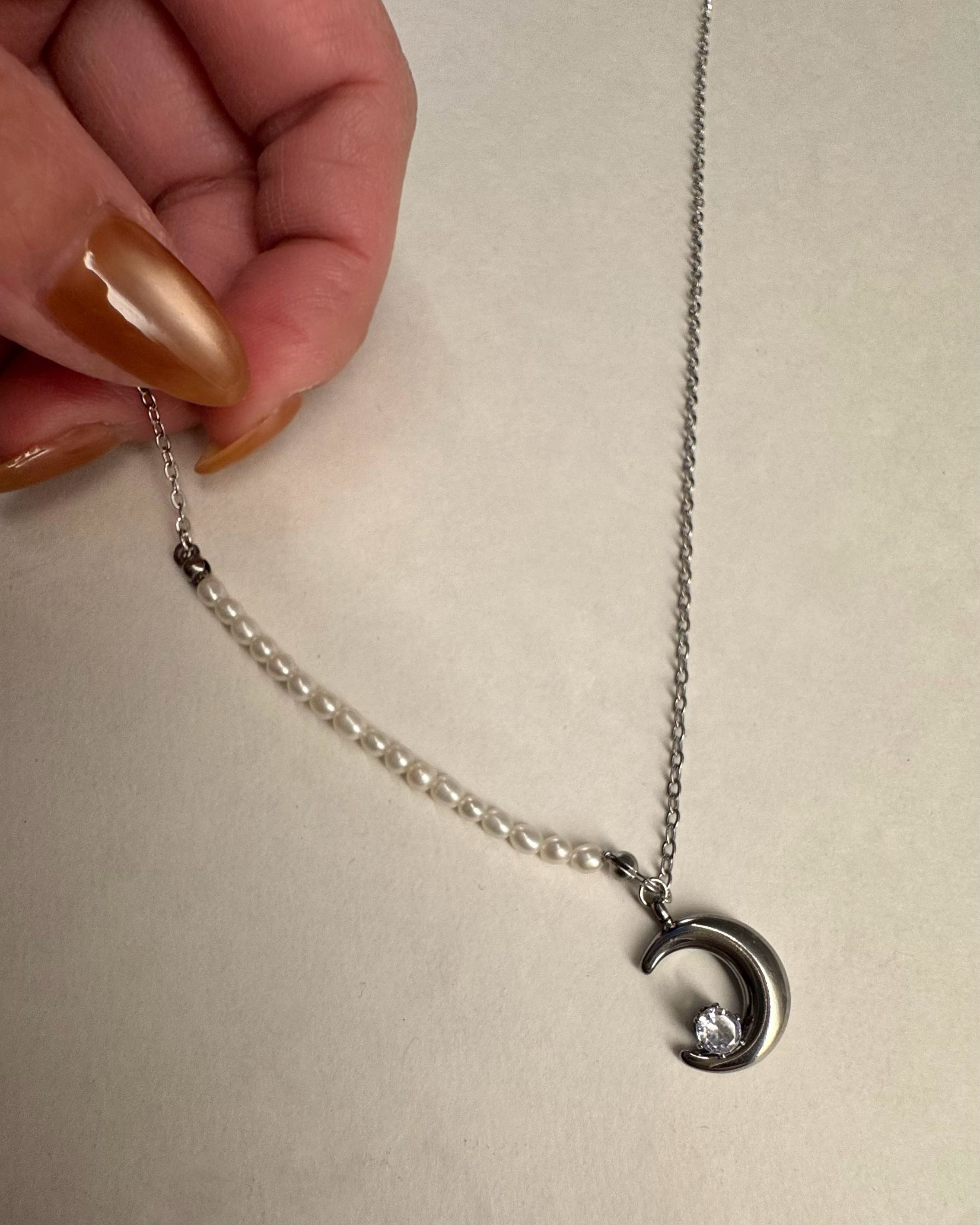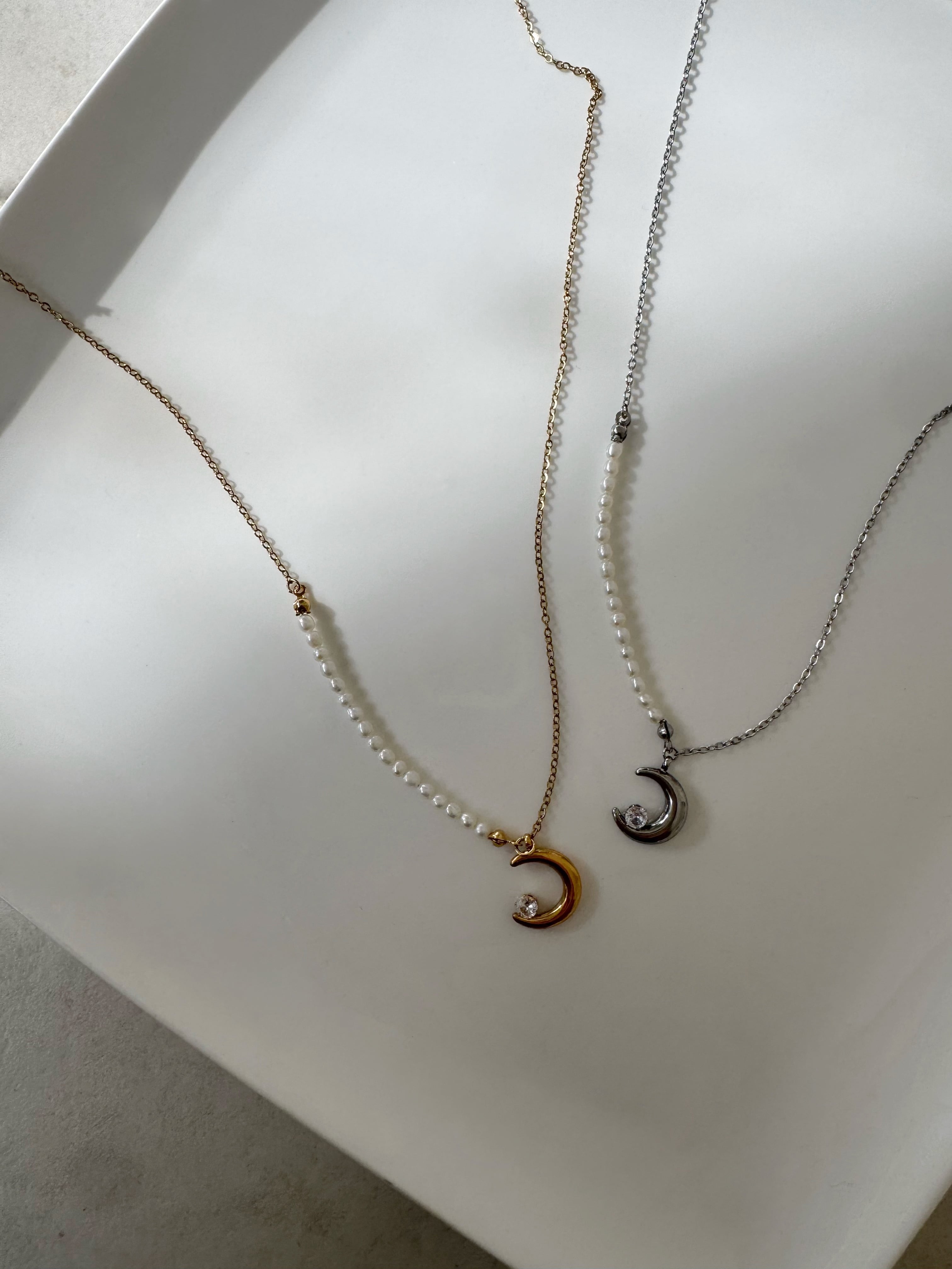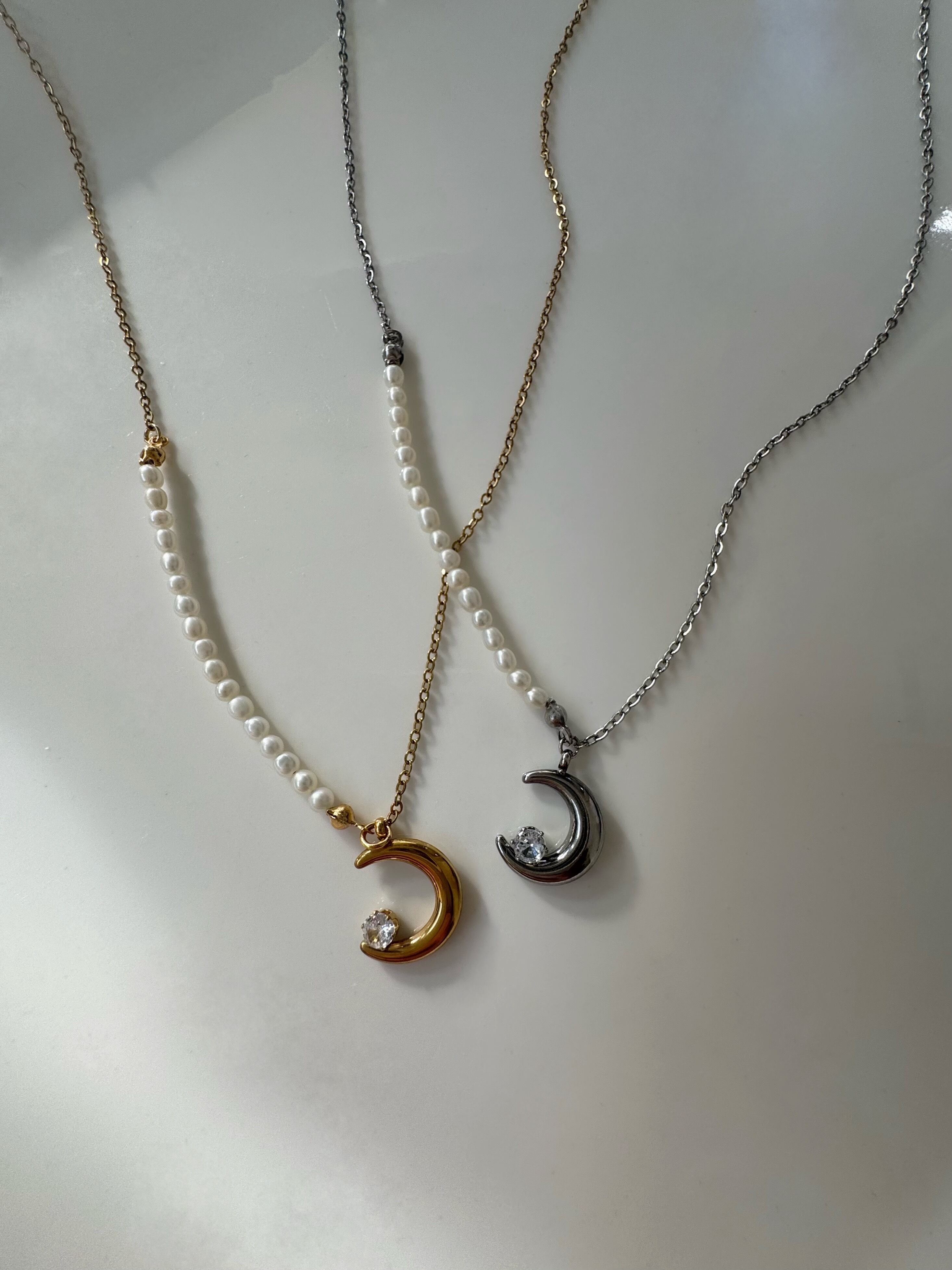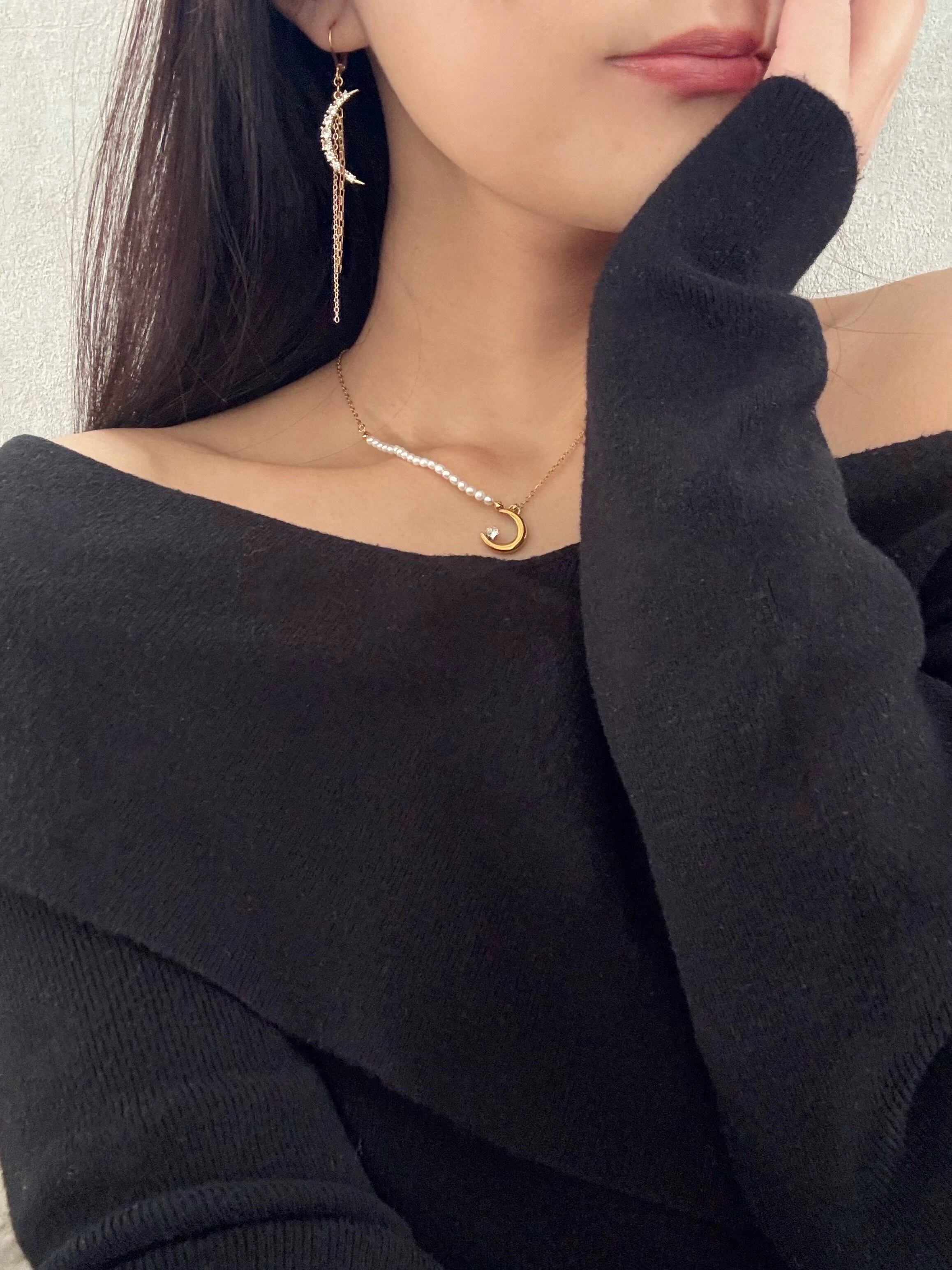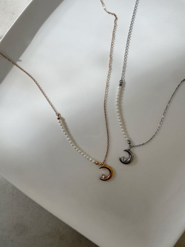 ネックレスはベビーパールと月モチーフの