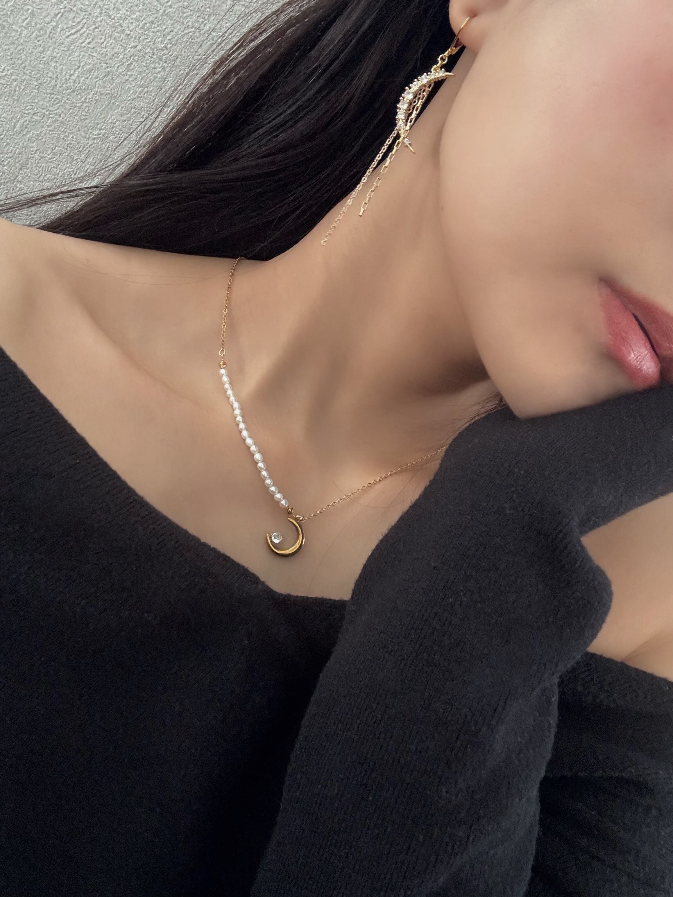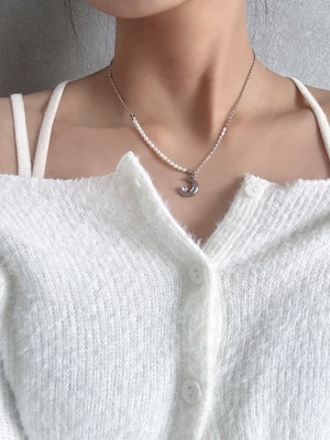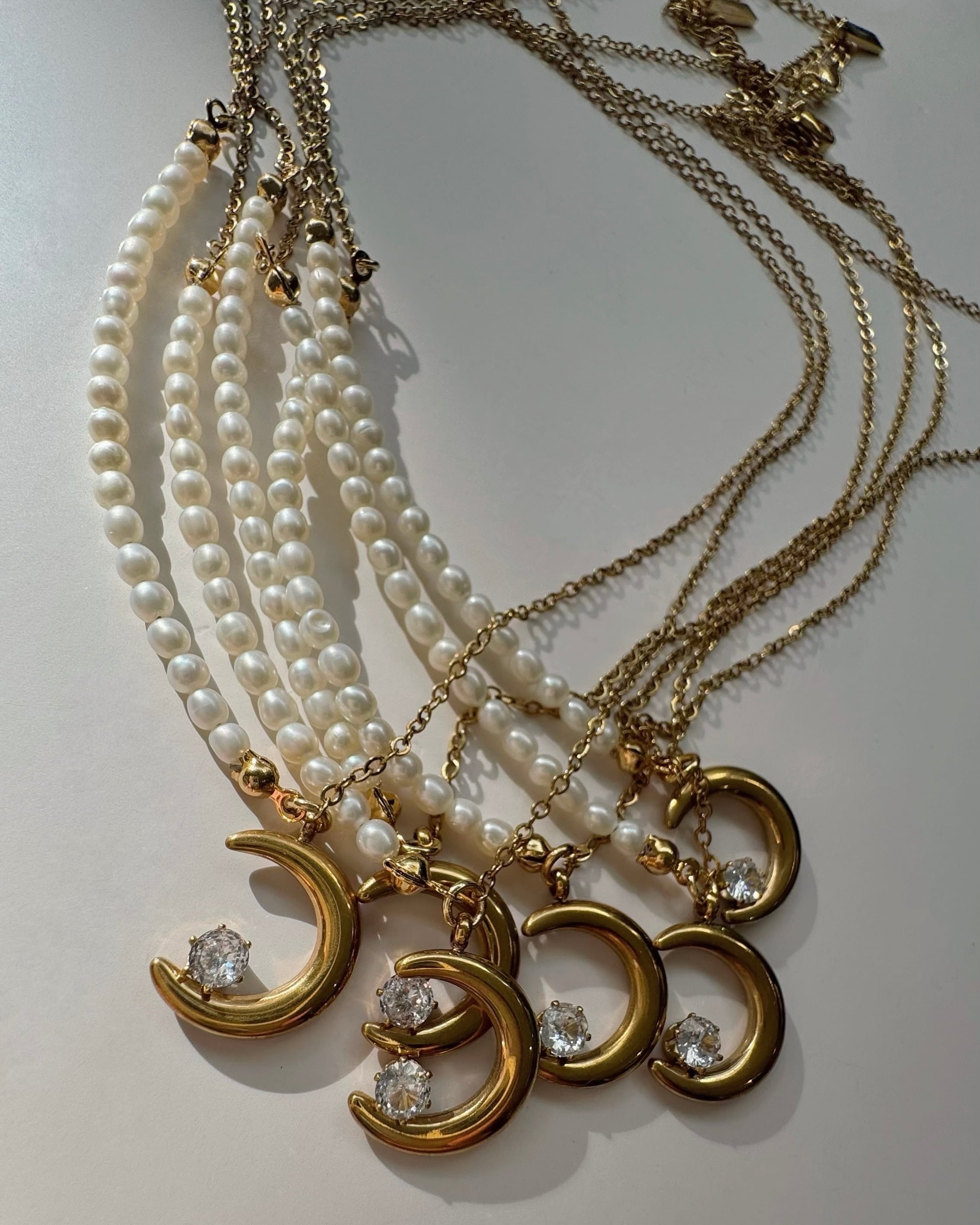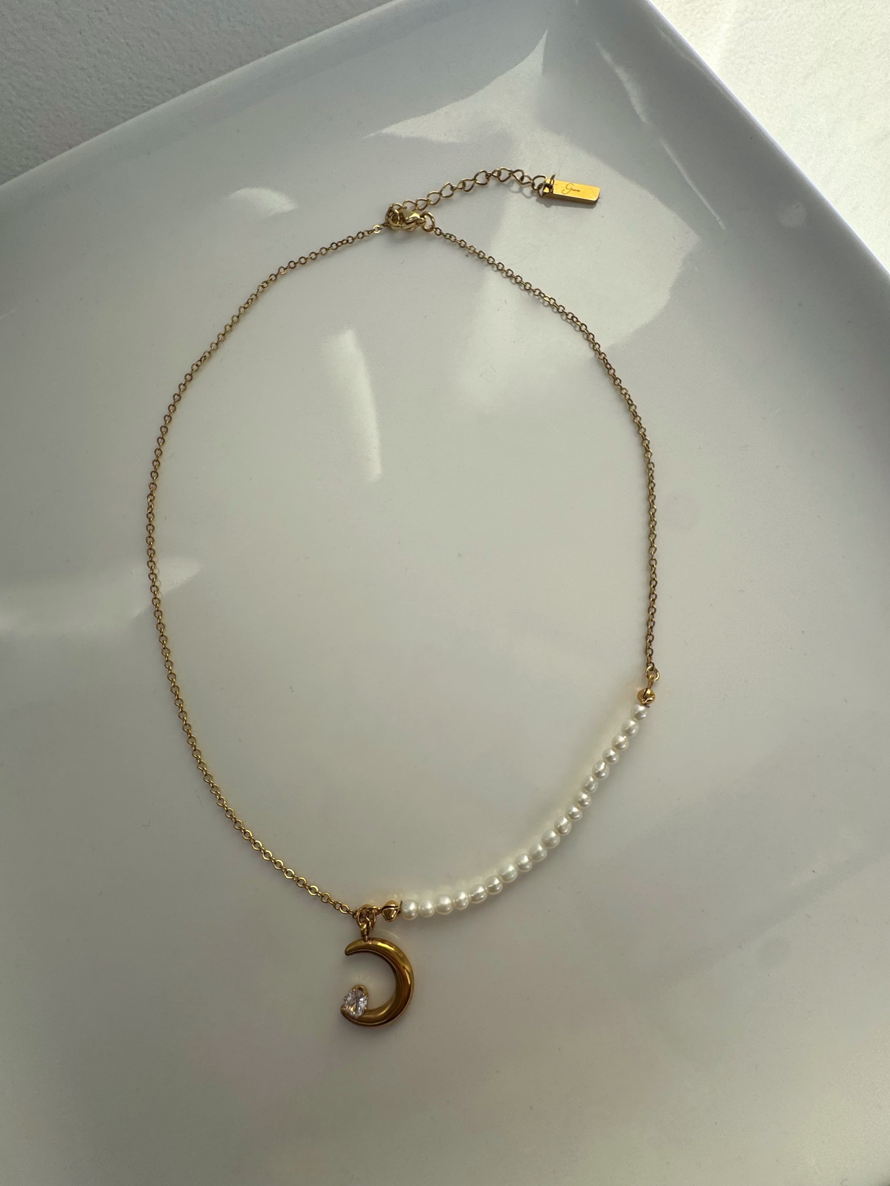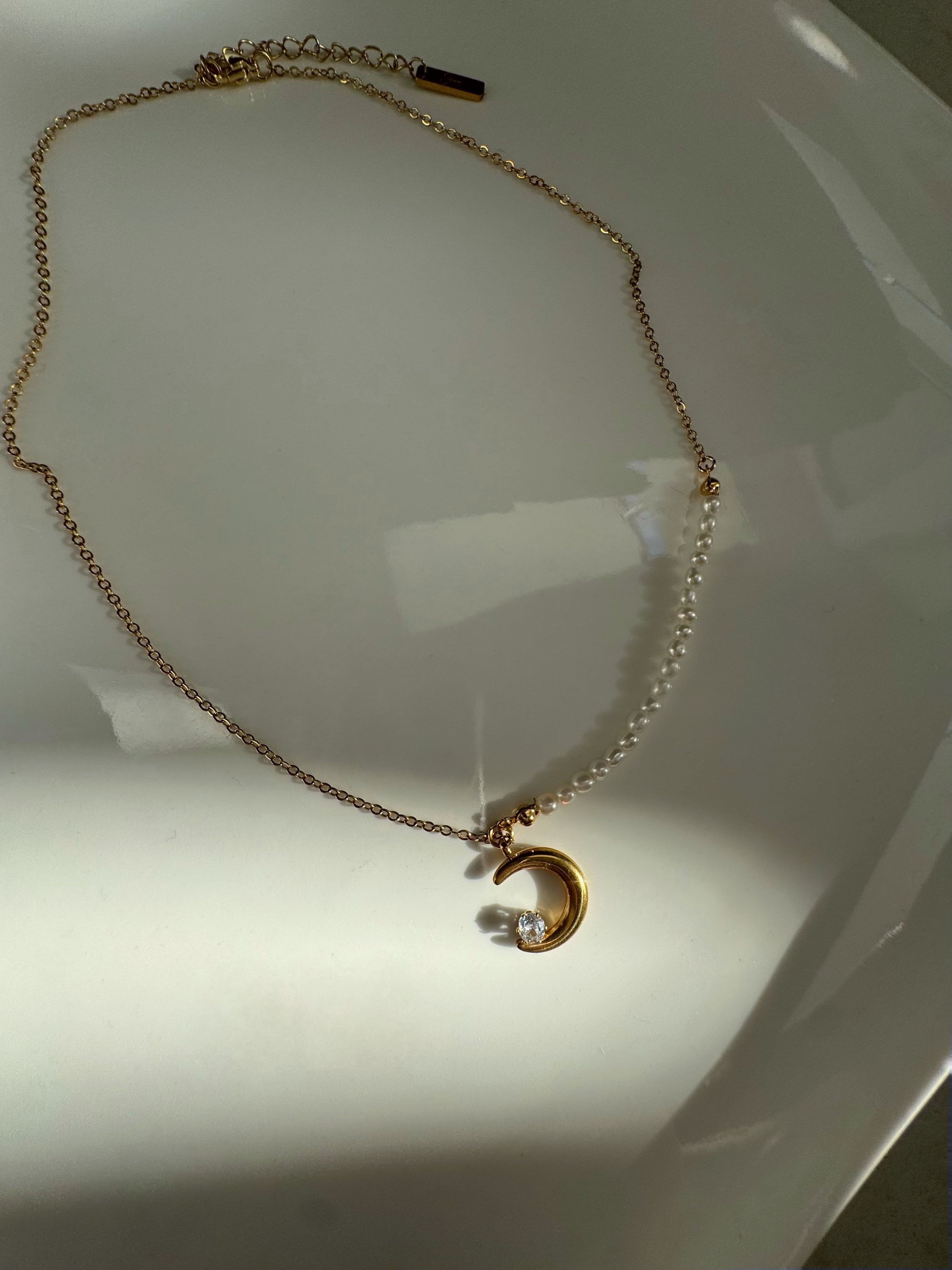 ネックレスはベビーパールと月モチーフの
